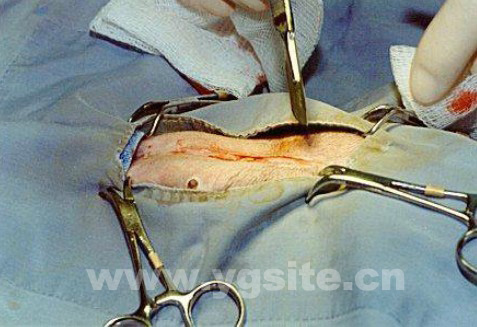 手术方法:术前用犬眠宝合剂全身麻醉,小型犬0.15-0.25毫升,大型犬1毫升左右皮下一次注射。麻醉确实后保定患犬,腹底部剃毛,依次用酒精和碘洒消毒术部并盖上创布,术者在耻骨前缘1厘米左右沿腹白线小心切开皮肤和肌肉,如有大血管应结扎,切开腹腔后,将子宫角小心引出切口,并在其周围缤塞消毒纱布。子宫角大弯处的切口长度以能取出胎儿为宜,取出胎儿时助手手提子宫,避免子宫掉入腹腔,取出胎儿后注意断脐和剥去胎盘。助手擦干胎儿全身并将其移入保暖处,缝合子宫前应用生理盐水反复冲洗子宫,其后依次连续和内翻缝合子宫,小心缝合腹膜、腹肌,随即缝合皮肤,解除保定,10日后拆除皮肤缝线。一般情况下,整个手术过程需35分钟左右。