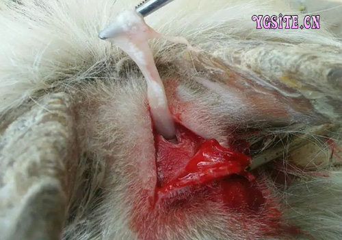 4、手术:手术部位的确定开口应在顶骨上,大脑颞顶叶部位,若为有角羊,在角根后缘方约1厘米的部位,距中线3毫米的顶骨上进行。手术方法手术部位剪毛,用2%碘酒消毒,再用75%酒精脱碘,在骨质变软的部位作 U字形切口,切透皮肤及皮下组织,但不切破骨膜,(增加愈合),分离皮瓣将它翻过用线加以固定。切口长宽均为2厘米(注意切口应在低处,及时止血),用圆锯(手术刀和钻)在骨质上开一小孔如一元硬币大小即可,用力均匀,使脑膜暴露(同时助手保定好羊)。确定包囊位置后,用注射针头避开血管刺入脑膜,发现有液体向外流出,然后连接注射器后抽动活塞,尽量吸取囊泡,直至吸尽为止,如果抽不出时,在脑内注入95%酒精7- 8毫升,即可杀死虫体。条件允许时也可直接用消毒后的镊子直接取出囊泡,发现囊泡如鸡蛋大小,泡内充满透明的液体,囊壁薄,如水铃铛,囊尾蚴在其中。取出包囊后,用止血纱布擦试手术部,滴入少量青霉素,把骨膜拉平,遮盖圆锯孔,然 后用结节缝合法缝合皮肤,缝完以后涂磺胺消炎粉,最后用碘酒消毒。手术后由专人保护羊的头部以免发生振动。