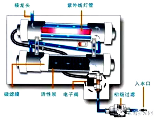 将紫外线消毒机链接到水线上,可通过紫外线的杀毒作用,杀死水中的细菌,从而避免水中菌丝的产生。