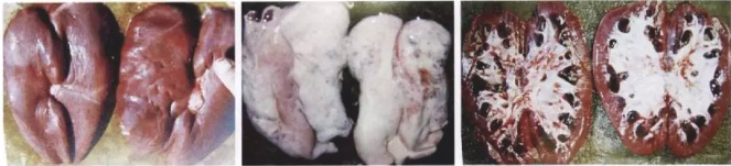 图6 图7 有的胎死子宫中,死胎腐败,皮肤、肌肉、内脏器宫溶解,化为脓水,断断续续从阴道中流出,骨头就留在子宫内(图9),造成子宫感染、化脓、子宫黏膜糜烂甚至穿孔(图8、图9),子宫浆膜与腹壁、脏器和肠道粘连(图10)。病情严重时,病猪消瘦,毛焦枯燥,腰背凸出,后肢软弱无力,屡配不孕。 图8 图9 图10 (三) 病理剖检变化 如果是膀胱炎-肾盂肾炎复合征的病猪,剖检时主要变化是肾脓肿、膀胱发生卡他性、出血性、化脓性或坏死性炎症;肾脏多发生单侧或双侧性肾盂肾炎,肾乳头出血、萎缩, 肾盂扩张,结缔组织增生(图13);怀孕病猪由于胎儿死亡、腐败、吸收,自体中毒,波及肾髓质部和皮质部时,可引起肾变形、变软,肾衰,高烧死亡(图11、图12)。 图11 图12 图13 膀胱、尿道口黏膜出血、坏死,膀胱内积脓(图14、图15)。 图14 图15 |
