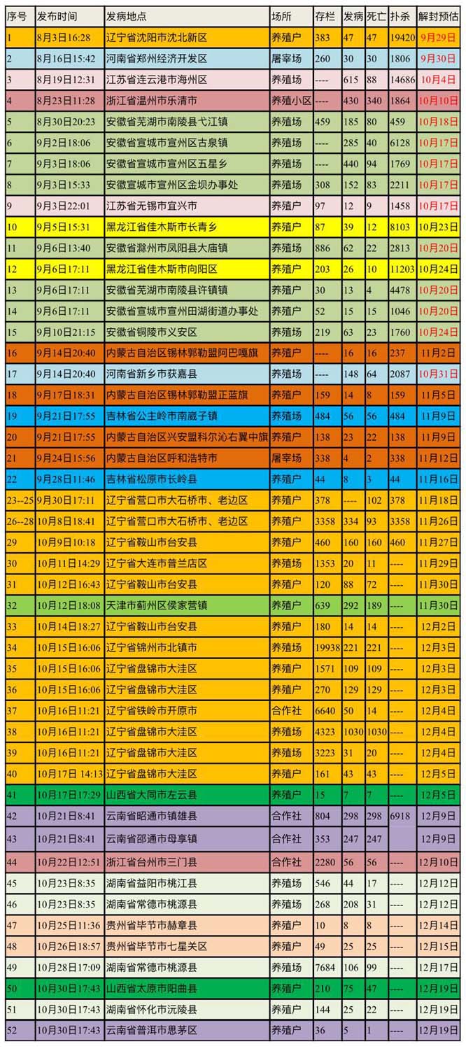 注:数据来源于农业农村部网站,扑杀数来源于OIE,解封预估按已经解封前4省平均值48天计算,红色是实际解封时间。不同颜色代表发生疫情省份。