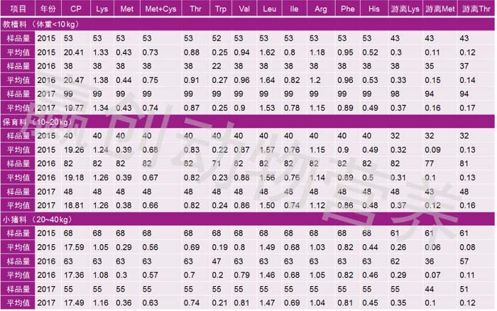 3. 我国仔猪饲料中粗蛋白和氨基酸含量调查和建议 业内通常认为,每降低1个百分点的日粮CP水平可以减少3%的水使用量、5%的粪便量、10%的粪便氮,降低10%的氨排放,提高饲料蛋白质利用率,减少动物代谢负担,降低饲料成本,提高养殖户收益。 国内外对仔猪蛋白质需要进行了大量研究,其评价指标包括生长性能、氮沉积、腹泻情况及消化道形态结构等。 蒋宗勇等建议4~10、10~20 kg仔猪日粮CP水平分别为20%、18%。 丹麦养猪研究中心建议在高腹泻风险阶段(6~15 kg),日粮钙和SID CP水平含量不能超过0.76%和17.7%。 当断奶仔猪发生腹泻时,猪场会调整营养配方。以9~20kg仔猪为例,日粮SID CP水平由17.7%降至16.8%,SID Lys水平由1.13%降至1.07%,钙水平由0.76%降至0.70%,同时采取相应管理措施,如增加饲喂次数(4次/天,每次15分钟内采食完成)及限制饲喂量等。 2015—2017年赢创在全国范围内采集猪全价商品饲料样品,采用湿化学分析方法检测CP、总氨基酸和游离氨基酸含量(表3)。我国教槽料CP含量由2015、2016年的20.41%、20.47%下降到2017年的19.77%,降低了0.64~0.70个百分点,降幅明显。同时随着教槽料CP含量的降低,饲料中晶体Lys、Met和Thr的添加量都呈现增加趋势,如游离Lys含量由2015年的0.30%增加到2017年的0.37%,游离Met含量由0.11%提高到0.16%。另外添加晶体氨基酸的饲料占整个饲料样品数量的比例也在提高,2015年教槽料的3种晶体氨基酸的添加比例都为81%,而2017年98个调查样品中,有98个饲料样品添加晶体赖氨酸(100%),94个饲料样品添加晶体Met和晶体Thr(95%)。降低CP含量的同时增加晶体氨基酸添加量,可保持教槽料中总氨基酸含量稳定。教槽料中的这些变化同样出现在保育料和小猪料中。可见低蛋白日粮应用和合成氨基酸添加已普遍被厂家所接受和认可。2017年我国教槽料的平均CP为19.77%,保育料CP为18.81%,小猪料CP为17.49%,建议猪体重小于10kg时的饲料CP水平为为8%,10~20kg的CP水平为为17%,20~40 kg的CP水平为为16%。与赢创推荐的CP水平相比,我国仔猪料CP水平有1.5~1.8个百分点的降低空间。 表3 2015—2017 中国猪教槽料、保育料和小猪料氨基酸和CP含量% 注:当检测游离Lys值<0.02,游离Met和游离Thr值<0.01时,数据不计入统计,即默认为小于这个值时是原料自带的流离氨基酸;Leu为亮氨酸,Arg为精氨酸,Phe为苯丙氨酸,His为组氨酸 4. 小结 近年来我国生猪养殖规模不断扩大,在疾病防控、饲料供应和粪污处理等环节面临更高的要求和挑战。低蛋白日粮通过补充合成氨基酸降低猪日粮蛋白质水平,在保持甚至提高猪的生产性能的同时,可降低饲料成本、改善饲料转化效率、减少氮排放、缓解和减少仔猪断奶应激和腹泻、提高仔猪肠道健康,是实现生猪养殖可持续发展的重要手段。低蛋白日粮应用的进一步深化提高需要更精准的动物营养需要量模型和饲料原料营养价值数据库,任重道远,但前途光明,意义重大。 |