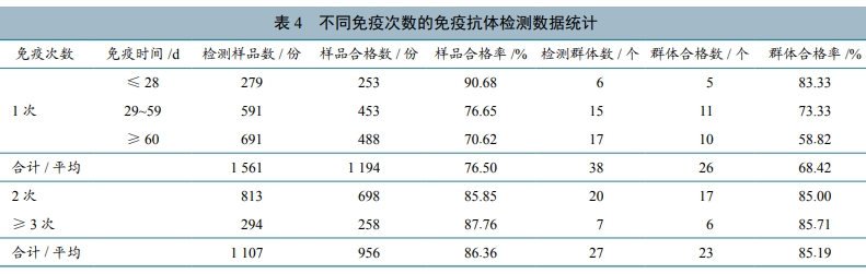 3 讨论 此次监测发现,种畜场的小反刍兽疫免疫效果好于商品场。这可能是因为种畜场更重视疫苗免疫,实施了更科学的免疫程序,并定期开展监测评估,及时补免补防。本次监测涉及的场点类别较少,因而监测结果不能全面反映全省羊群的免疫效果,今后需增加屠宰与交易等环节的监测。 个别地市, 如开封市(67.59%)、周口市(62.06%)、洛阳市(55.47%)存在免疫抗体低下甚至不合格的现象。这一方面与各地市重大动物疫病免疫政策的制定及防控工作的执行力度有关,另一方面与养殖场对免疫工作的重视程度、疫苗保管与接种人员素质等有关。因此,部分市县出现小反刍兽疫疫情的风险依然存在,尤其是新引入的未免疫或免疫抗体低下的羊群,发生风险更大,因此仍需继续做好小反刍兽疫的强制免疫、监测和流行病学调查工作,科学评估免疫效果和疫情发生风险。 目前河南省所用小反刍兽疫疫苗是 Vero 细胞培养的弱毒活疫苗。该活疫苗自 2007 年 10 月开始在我国应用。研究表明,羊只初免或补免后 7 d开始产生抗体,14 d 后抗体直线上升,21~28 d 达到高峰,随后可较长时间处于免疫保护状态。但本次监测发现,单次免疫 60 d 后,免疫抗体水平仅维持在 70% 左右,而免疫 2 次及以上,免疫合格率可维持 85% 以上;而且有学者通过小反刍活疫苗二次免疫试验证实,二次免疫增强了免疫效果,且对已经产生的小反刍兽疫抗体不会产生中和抵消作用,可明显提高免疫抗体合格率;同时,考虑到即便免疫抗体合格率达到了 70% 以上的要求,鉴于羊个体敏感性差异及防疫人员免疫操作水平、疫苗保存条件等因素,仍会造成部分羊只未达到免疫保护标准,在疫病暴发时会对养殖户造成损失。因此,建议各养殖户制定更加科学的免疫程序,每年春秋各集中免疫 1 次小反刍兽疫活疫苗,并定期进行小反刍兽疫免疫抗体水平监测,及时对新生羔羊和新入栏羊只进行疫苗接种,对免疫抗体水平较低与不合格的羊只进行补免,及时发现、报告和处置疑似疫情,消除疫情隐患,争取早日使小反刍兽疫退出国家强制免疫计划,同时加强羊只引种检疫和流通环节监管,加强小反刍兽疫防控技术的宣传指导,提高基层兽医工作者和养殖户的防控意识,最终实现小反刍兽疫消灭计划。 4 结论 此次专项监测发现:河南省羊小反刍兽疫整体免疫效果较好,平均抗体合格率在 80% 以上;未检出病原学阳性样品,大面积疫情发生风险较低;但部分地区的免疫水平较低,存在复发疫情的风险。因此,建议继续做好小反刍兽疫强制免疫、监测和流行病学调查工作,科学评估免疫效果和疫情风险,尤其是对免疫效果较差的地区;同时加强羊只引种检疫和流通环节监管以及小反刍兽疫防控技术的宣传指导,提高基层兽医工作者和养殖户的防控意识。 |