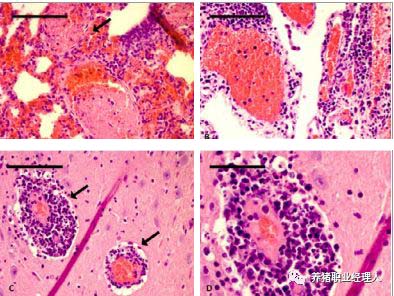 (A. 肺脏严重充血,血管因血栓堵塞而显著扩大(箭头所指);B. 脑脉络丛血管严重充血,部分血管周围出现单核细胞浸润;C-D. 脑实质血管周围出现大量单核细胞浸润,呈“血管套” 现像,浸润的单核细胞出现核碎裂。)