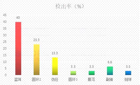 为及时让养殖场了解疫病流行状况,特将2020年一季度病原检测进行总结,具体猪病检测情况如下: 一、各地区送检 ![]() 本季度受新年及新冠疫情的影响,检测量偏少,共收到检测病料为94份,检测区域主要集中于山东及周边省份,主要包括山东、河北、辽宁、江苏、陕西、重庆、湖南、广东等9个省份。 二、病原检测结果统计 1、常见病原检出比例 (1) 蓝耳仍旧是威胁猪场安全的重要因素,其检出率高达40%,其次伪狂犬对猪场的威胁呈上升趋势; (2) 圆环2和流行性腹泻检出率分别为23.3%、3.3%,由于年前总结的疾病预警,各大猪场对圆环和腹泻重视程度加大,相关送检和检出有所提升。圆环3作为威胁猪场安全的新型疾病,检测中心后续会加大对其追踪; |