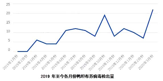 近期坦布苏病毒在肉鹅上检出率有所上升,发病日龄集中在30~81。鸭坦布苏病毒单独感染病例极少,与流感、鸭源新型小鹅瘟、鸭星状病毒、鸭肝炎、巴氏杆菌、浆膜炎、圆环等常见疫病混感率极高。这段时间坦布苏病毒感染病例剖检症状多表现为包心包肝、气囊炎等,神经症状以及特征性剖检症状不典型,极易与H9、大肠杆菌、浆膜炎等疾病混淆,这类病例只能通过实验室检测发 现,眼观不易察觉,而且视混感疫病的不同种类以及数量的不同, 死亡量在 10、20 只/天~200、300 只/天。 五、鸭肝炎及鸭星状病毒 本季度鸭肝炎检出率为 3.99%,主要集中在山东地区,临沂、潍坊、聊城等养鸭密集地区都有所涉及。发病日龄为 4—35,跨度较大,日龄越小死亡量越大,且大日龄发病个体极容易继发浆膜炎、鸭源新型小鹅瘟、圆环等其他疾病。鸭肝炎阳性病例中,感染 C 型者居多,肝脏肿大、出血,症状典型,部分群体紧急免疫抗体效果不错,但是极容易复发,呈反复发作态势;部分群体则无效。 |