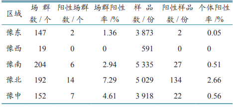 表2 2019 年河南省PRRSV 病原检测不同季节分布 2.3 区域分布 按豫东、豫西、豫南、豫北和豫中 5 个区域,对检测结果进行统计发现:5 个区域的 PRRSV 抗体个体合格率和场群合格率均在 70% 以上;除豫西地区外,PRRSV 在其他区域内均有流行,场群阳性率率和个体阳性率分别介于 1.36%~7.29% 和0~2.66%,其中豫北地区个体阳性率和场群流行率均最高。具体结果见表 3~4。 表3 2019年河南省不同区域PRRSV 抗体检测统计 表4 2019年河南省不同区域PRRSV 病原检测统计 2.4 场群分布 按种畜场、商品代养殖场、散养户、屠宰厂和无害化处理厂,对检测结果进行群间分布统计。结果(表 5~6)显示:除无害化处理厂没有进行抗体检测外,其他类别场点的 PRRSV 抗体个体合格率和场群合格率均在 70% 以上;除屠宰厂外,其他类别场点中均有 PRRSV 检出,场群阳性率和个体阳性率分别介于 0.99%~12.11% 和0.07%~4.15%,其中无害化处理厂的个体阳性率和场群阳性率均最高。 表5 2019 年河南省不同类别场点PRRSV 抗体分布 |