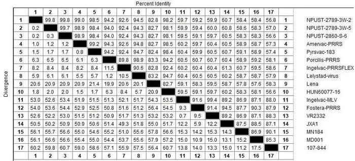 图S2 台湾分离欧洲株ORF5核苷酸序列与其他蓝耳参考毒株ORF5的同源性 4 讨论 我们之前曾报道过中国台湾疑似爆发PRRSV 1,但未被确认。本研究在某蓝耳病爆发场分离到欧洲型蓝耳毒株,将其全基因序列和各片段序列进行分析比对,我们清晰的发现其与欧洲蓝耳疫苗毒株 Amervac PRRS同源性最高。到目前为止台湾有四种商品化蓝耳活疫苗 Ingelvac PRRS® MLV (PRRSV 2, 勃林格殷格翰)、Fostera® PRRS (PRRSV 2, 硕腾)、Amervac PRRS (PRRSV 1, 海博莱) and Pyrsvac-183 PRRS (PRRSV 1, Syva) (表1)。 有趣的是在过去的十年里,这个农场没有用任何欧洲型或北美型蓝耳疫苗进行免疫,也没有从国内繁殖群中引进公猪或母猪。近十年来,台湾一些养猪场在使用Amervac PRRS活疫苗。因此我们推测台湾该猪场欧洲型蓝耳病爆发是由 Amervac PRRS 活疫苗毒返强适应猪群而传播到猪场。1998年在北美型蓝耳毒株也曾出现过类似情况,丹麦一养猪场北美型蓝耳病的爆发是由于蓝耳疫苗毒传播所致。因此,欧洲型蓝耳病毒在台湾地区的流行病学调查值得进一步研究。 近几年在匈牙利、丹麦和中国大陆有多个农场欧洲型蓝耳病疑因疫苗毒引发的病例报告。匈牙利的欧洲型蓝耳毒株 HUN60077/16基因组具有镶嵌结构,与中国台湾欧洲型疫苗毒 Amervac PRRS具有密切的遗传关系。 在中国大陆也发现了类似的报道,类似Amervac PRRS分离株由疫苗毒株和野毒重组而成。某些问题需要进一步调查: (1)其他欧洲型或北美型蓝耳疫苗毒引发的病例; (2)减毒活疫苗的毒力返强问题; (3)导致PRRSV稳定或无PRRSV农场暴发的低毒力蓝耳毒株。 因此,病毒的起源、进化以及疫苗毒株、野毒株之间的差异值得进一步研究 。 总之,本研究是首次确认在台湾爆发的欧洲型蓝耳病与欧洲型蓝耳疫苗毒株有同一个进化祖先。本次在中国台湾暴发的欧洲型蓝耳病是由于蓝耳疫苗毒传播所致。 |