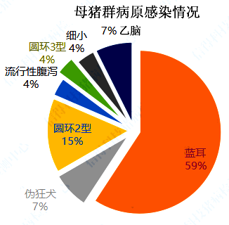 母猪群大多因繁殖障碍送检,其中导致繁殖障碍的蓝耳和圆环检出较高为59%、14.81%,值得注意的是伪狂犬、圆环3检出率有所提高,其通常与蓝耳混合感染,导致母猪发生流产、死胎等问题。