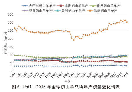 1.3 世界奶山羊单产情况 尽管欧洲奶山羊存栏数仅占全球奶山羊存栏数的约4%,但其奶山羊只均年产奶量始终远超其他各大洲。以2018 年数据为例,世界奶山羊只均年产奶量为86.5 kg,而欧洲奶山羊只均年产奶量高达299.8 kg(图6)。自20 世纪90 年代至2018 年,美洲和亚洲奶山羊只均年产奶量略高于世界平均水平,但非洲和大洋洲奶山羊只均年产奶量低于世界平均水平。 从FAO 数据中选择2018 年奶山羊只均年产奶量在100 kg 以上的国家进行分析,结果如图7 所示,与奶山羊存栏量截然不同的是,奶山羊只均年产奶量排名世界前十位的无一例外均为欧洲国家,其中比利时以只均奶山羊年产奶量1 209.50 kg 居世界首位,而奶山羊存栏世界首位的印度,其奶山羊只均年产奶量为165.60 kg,居世界第40 位。 |