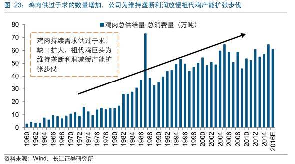 需求层面,鸡肉消费增加倒逼祖代鸡产能增长。2014 年和 2015 年全球肉鸡生产量分别为 8607 万吨和 8739 万吨,同比分别增长 1.82%和 1.53%;全球鸡肉总消费量分别为9542 万吨和 9651 万吨,同比分别增长 2.34%和 1.14%。禽类产品下游需求的增加客观上需要上游产能的增长与之匹配,由此推断未来祖代鸡产能将保持增长态势。 技术门槛+利益需求限制增量 我们判断,尽管从趋势上看,全球祖代鸡的产能是呈上升态势,但是其增量则表现出下降趋势,主要原因如下: (1)技术门槛限制产能扩张速度。一方面,由于祖代鸡育种具有一定的专业性,在场地、温度、饲料、疫病控制等方面有较严格的技术要求,随着育种技术的进步和产能的不断扩张,祖代鸡生产性能的优化难度加大,因此产能增长空间有限;另一方面,行业龙头已经凭借技术上的先发优势占领市场,其产能规模相对较大,继续快速扩张的成本提升,边际收益下降,由此造成祖代鸡产能增速放缓。 (2)利益需求抑制产能扩张积极性。由前文分析可知,世界三大家禽育种公司分享了整个市场 97%的利润,在此背景下,公司维持高额垄断利润的利益需求致使其增量扩产的动力不足。除此之外,从终端需求方面看,鸡肉消费的增速从 2010 年的 5.64%下降到 2015 年的 1.14%,肉鸡产量的增速从 2011 年的 4%下降到 2015 年的 1.53%,禽类产品消费需求的增速放缓挤压祖代鸡产能放量上升空间。 中国祖代鸡面临引种缺口 通过分析过去历年祖代鸡引种量,可以看出,中国祖代鸡引种量的变动受禽流感疫情影响较大。近 5 年在行业周期波动和美法等国禽流感疫情频发的双重因素作用下,祖代鸡引种量持续下滑,我们预计,16 年中国祖代鸡引种缺口将超过 70 万套,在考虑强制换羽的情况下,缺口约为 54 万套。 总结历史:祖代鸡引种量受禽流感疫情持续影响 整体上,中国祖代鸡引种量呈上升趋势,从 1997 年的 64 万套上升到 2014 年的 119 万套,增长 86%,但在禽流感疫情大规模爆发的年份,引种量则出现明显下滑。近两年,在美英法等国的禽流感疫情爆发频繁的影响下,中国祖代鸡引种量出现明显下滑,预计15、16 年分别为 70 万套和 30 万套。 |