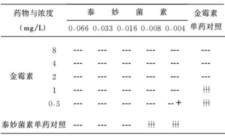 图2 细菌核糖体组成 4. 临床试验 4.1金霉素与泰妙菌素联合用药治疗鸡慢性呼吸道疾病(chronic respiratory disease, CRD) 本病又称鸡败血霉形体病、鸡败血支原体病,其病原体为鸡败血霉形体(Mycoplasma gallisepticum,MG) 4.1.1体内试验 表1 金霉素、泰妙菌素合用对MG BG44T的联合药敏试验 注:(1)表中所列为3个棋盘的试验结果;(2)”-”表示无MG生长;”+”表示有MG生长;(3)培养物对照结果; FIC指数计算如下:FIC1=0.004/0.016+0.5/2=0.5,FIC2=0.004/0.016+0.5/2=0.5,FIC3=0.008/0.016+0.5/2=0.75, 即两药合用表现为增强作用或相加作用(均属协同作用) FIC指数判读标准:当FIC指数小于0.5时,两种药为协同作用;当FIC指数为0.5~1时,两种药为相加作用;当FIC指数大于l且小于2时,两种药为无关作用;当FIC指数大于2时,两种药为拮抗作用。 FIC指数为(药a单独使用的最小抑菌浓度除以药a和药b联合使用的药a最小抑菌浓度)加上(药b单独使用的最小抑菌浓度除以药a和药b联合使用的药b最小抑菌浓度) |