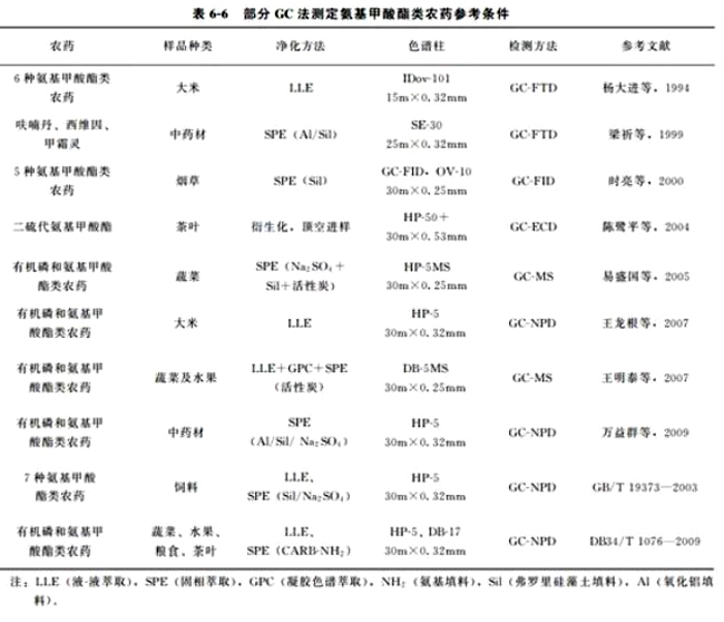 蒋施等称取蔬菜或食用菌样品20.0g于100mL离心管中,加入丙酮-乙腈(85∶15)混合溶剂40mL,用3.0mol/mL氢氧化钠溶液调pH至9~10,均质提取1min;用少量混合溶剂清洗均质器,并入离心管中,以4000r/min离心5min,上清液转移至分液漏斗,加入50g/L氯化钠溶液50mL,再依次用25mL、20mL、15mL二氯甲烷萃取,萃取液通过装有10g无水硫酸钠的漏斗滤入快速浓缩瓶中,于35℃真空快速浓缩至近干,将残渣用甲醇-二氯甲烷(1∶99)混合溶剂20mL溶解,注入PSASPE柱[3mL/200mL,用前先加入甲醇10mL,再加入甲醇-二氯甲烷(1∶99)混合溶剂10mL,充分活化],用甲醇-二氯甲烷(1∶99)混合溶剂洗脱,控制洗脱速率约为10mL/min,收集洗脱液7mL于35℃浓缩至近干,残渣用甲醇-水(2∶8)混合溶液1.0mL溶解,过0.2μm膜,供LC-MS/MS仪测定19种氨基甲酸酯类农药残留。 6 检测方法 在氨基甲酸酯类农药残留的检测方法中,目前较为常用的有气相色谱法(GC)、气相色谱质谱法(GC-MS、GC-MS/MS)、液相色谱法(LC)、液相色谱质谱法(LC-MS、LC-MS/MS)和快速检测法;也有一些方法如薄层色谱法、分光光度法、放射免疫法等由于方法或设备的局限曾经有过研究但应用不多;另外,生物传感器和临界流体色谱技术目前仍处在研究阶段,在方法和设备上仍需要进一步完善。 6.1 GC 和 GC MS、GC-MS/MS法 GC是目前用于测定有机磷和氨基甲酸酯类农药残留较为常用的农药残留检测方法。对热较为稳定的氨基甲酸酯类农药可直接采用GC配氮磷检测器(NPD)、氢火焰离子化检测器(FID)、电子捕获检测器(ECD)进行检测。在农药残留检测中,MS检测器有着明显的优势,在GC中,自从MS检测器与GC仪实现联机之后,大大地拓宽了GC法测定氨基甲酸酯类农药的检测范围,使得许多采用传统检测器无法检测的农药能获得较低的检测限。GC-MS由于具备GC的高分离性能和MS的高鉴别性能,具有灵敏度高、抗干扰性强、定性准确可靠的特点。GC-MS/MS又进一步提高仪器的特异性和灵敏度,在氨基甲酸酯类农药残留的检测中有着广阔的应用前景。在方法开发中,速灭威、灭虫威、恶虫威、乙霉威、仲丁威、残杀威、异丙威、甲萘威、抗蚜威、二甲威、丙硫克百威、丁硫克百威、克百威、灭多威、涕灭威、涕灭威砜、涕灭威亚砜、3-羟基克百威、禾草丹已相继在采用GC技术直接检测氨基甲酸酯类农药残留的相关文献中出现。采用GC与GC-MS(或GC-MS/MS)法检测氨基甲酸酯类农药残留的一些方法条件见表6-6。 典型的GC法测定氨基甲酸酯类农药残留的方法如高生等制定的国家标准(GB/T 19373-2003),采用GC法检测饲料中的速灭威、叶蝉散、仲丁威、虫威、呋喃丹、抗蚜威和西维因7种氨基甲酸酯类农药残留。该方法的原理是以丙酮提取配合饲料或浓缩饲料中氨基甲酸酯类农药,加硫酸钠水溶液,用石油醚提取,经弗罗里硅土柱净化,然后用配有氮磷检测器(NPD)和毛细管柱的气相色谱仪测定。色谱的参考条件如下:色谱柱,HP-5毛细管柱,30m×0.32mm;升温程序,170℃保持1min,以8℃/min的速度升至230℃,保持12min;检测器及温度,NPD,280℃;载气,氮气,纯度≥99.99%,流量,2.0mL/min;氢气,3.0mL/min;空气:80mL/min;尾吹气,20mL/min;进样模式,不分流进样,06min后开阀;进样量,1μL。 |