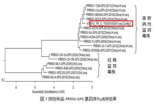 3、实验室诊断: 3.1 应用PCR技术进行检测 对送检的病料进行猪瘟、圆环、蓝耳和支原体检测,根据图5、图6PCR检测结果显示蓝耳为强阳性,猪瘟、圆环、支原体检测为阴性。 3.2 测序 对检测阳性样进行PRRSV-GP5基因序列的测序。通过序列比对,红色部分为样品,测序为550bp,结果显示:该猪场发生的蓝耳病为2014年山东流行的高致病性蓝耳毒株,同2014年山东C9株相似性为99.48%,出现4个碱基的突变,与高致病性蓝耳毒株TJM的相似性为99.10%,而与高致病性蓝耳毒株HUN4的相似性为99.24%;同经典蓝耳毒株CH-1a的相似性仅为94.58%,说明猪场的发病是由2014年流行的高致病性蓝耳毒株引起发病。 |