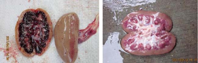 14、 腹腔:腹股沟和肠系膜淋巴结索状肿大、铁锈色出血,多考虑圆环病毒。黑亮黑亮、大理石样出血多考虑猪瘟。输尿管肥大、水肿,圆环病毒感染。保育猪结肠上有白点:可能为沙门氏菌引起的副伤寒。大猪结肠有白点,可能为结节虫。结肠系膜水肿,圆环或副猪。