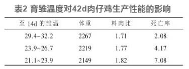 2.1.2 温度的判断 正确判断温度是否适宜应以鸡群的分布为准, 雏鸡行为是温度合适与否的最佳指示;雏鸡入舍2h后抽取100只检查鸡爪温度, 鸡爪放在人的脖子上不觉有凉感或放在额头上稍微低一点说明温度适宜。应经常观察雏鸡行为, 用测温计进行测定并及时做出反应。 2.2 育成期 (5~24周) 育成期鸡舍温度控制在20~25℃较好, 如有持续温度变化需要适当考虑加减饲料, 育成期相对湿度控制在40%为佳。 2.3 产蛋期 (25~66周) 产蛋期适宜温度为18~25℃, 13~16℃产蛋较高, 15~20℃饲料转化率较高。应尽可能的保证产蛋鸡舍最低温度不低于13℃, 最高温度不高于30℃。 3 现场看到的问题 3.1 育雏期 雏鸡入舍时垫料温度较低对温度与通风和湿度的相互影响重视不够。 3.2 育成期和产蛋期 昼夜温差较大、通风不足或过度导致温度控制失衡, 严重时诱发疾病, 降低生产性能的发挥。 4 正确控制温度 4.1 避免温度过高或过低, 造成热冷应激 应避免育雏温度太高或太低, 造成冷应激和热应激现象的出现, 影响鸡群的生产性能, 见表2。如果温度达到40℃, 卵黄中的水分8~10h就会耗尽, 造成脱水、矮小综合症、死亡率高、饲料报酬低、均匀度差。出雏到入舍, 如果无料无水, 雏鸡体重每24h会损失4g左右, 炎热气候条件下这种情况会更为严重。冷应激会造成种鸡受凉、影响消化、生长速率和均匀度较差, 易发生腹水症, 免疫功能下降, 见表3。 |