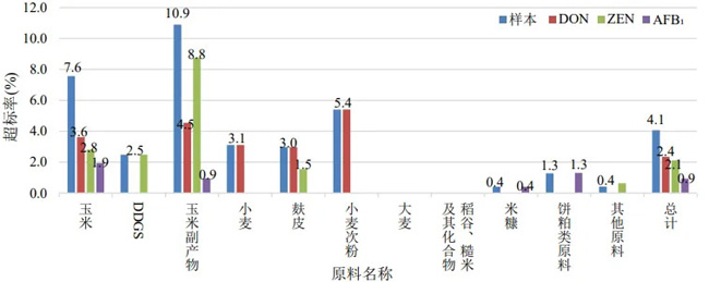 ![]() 图1 2024年7月各原料霉菌毒素超标率 4.2 饲料原料霉菌毒素超标率比较 图2 近3个月各原料霉菌毒素超标率 由图2可以看出,玉米副产物、小麦次粉本月霉菌毒素超标率分别为10.9%、5.4%,均达重度污染,较上个月毒素超标上升严重;玉米、小麦、米糠本月霉菌毒素超标率分别为7.6%、3.1%、0.4%,达重度、中度、轻度污染,较前两月毒素超标均有所下降;DDGS、麸皮本月霉菌毒素超标率分别为2.5%、3.0%,均达中度污染,较上个月毒素超标均有所上升;饼粕类原料本月霉菌毒素超标率为1.3%,达轻度污染;大麦连续2个月未出现霉菌毒素超标情况;稻谷糙米及其混合物连续7个月未出现霉菌毒素超标情况。 |