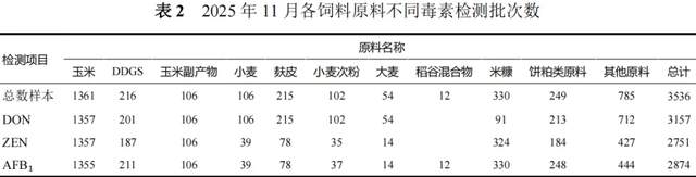 2025年11月,安佑集团共检测饲料原料样本3536份(表1),对大部分原料中呕吐毒素(DON)、玉米赤霉烯酮(ZEN)、黄曲霉毒素B1(AFB1)3种毒素进行检测,同时根据不同样品受霉菌毒素污染的特点,侧重检测了某种毒素,检测数据共8782项,其中DON 3157项,ZEN 2751项,AFB1 2874项 (表2)。