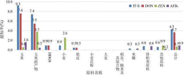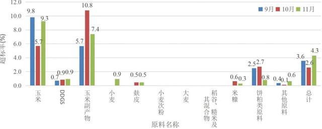 图1 2025年11月各原料霉菌毒素超标率 4.2 饲料原料霉菌毒素超标率比较 图2 近3个月各原料霉菌毒素超标率 由图2可以看出,玉米、小麦本月霉菌毒素超标率分别为9.3%、0.9%,达重度、轻度污染,较前月霉菌毒素超标有所上降;DDGS、麸皮本月霉菌毒素超标率分别为0.9%、0.5%,达轻度、轻度污染,较前月霉菌毒素超标基本持平;玉米副产物、米糠、饼粕类原料本月霉菌毒素超标率分别为7.4%、0.3%、0.8%,达重度、轻度、轻度污染,较前月霉菌毒素超标有下降趋势;小麦次粉、大麦、稻谷糙米及其混合物连续3个月未出现霉菌毒素超标情况。 4.3 产地污染分析 本月数据显示,对于玉米,天津、河北、山西、内蒙古、东北、河南、陕西产地DON污染重度,江苏、河南、陕西产地AFB1污染重度;河北、云南产地ZEN污染中度,河北、山西、进口产地AFB1污染中度;东北产地ZEN污染轻度,云南产地AFB1污染轻度。对于次粉,各地区霉菌毒素污染均未出现超标情况;对于麸皮,河北产地DON污染中度。对于米糠,湖北产地ZEN污染中度。 |