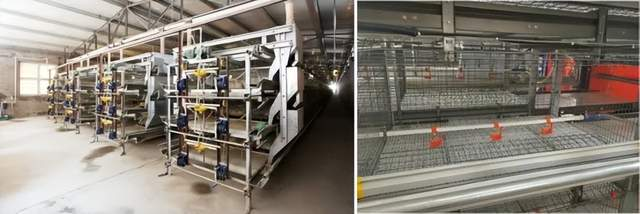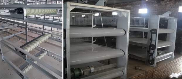 2、饮水设备 配套充足且洁净的供水系统,水质应符合《无公害食品畜禽饮用水水质》(NY5027)的要求。供饮水系统包含供水设备、水表、过滤器、自动加药器、饮水管、360°饮水乳头、接水槽(杯)、调压阀、水管高度调节器等,水线液位显示等(图2)。鸡舍水线进水处应设置加药器、过滤器,实现饮水过滤和自动化饮水加药。水线设计安装时要方便消毒清洗,避免细菌和藻类滋生;水线高度要可随时调整,保证整个养殖周期中鸡只饮水有舒适的高度。 图2 肉鸡立体笼养饮水系统 3、清粪设备 应采用传送带式清粪系统,包括纵向、横向、斜向清粪传送带、动力和控制系统,实现高效及时清理粪尿,防止粪便在舍内滞留。每层笼底均应配备传送带分层清理,由纵向传送带输送到鸡舍尾端,各层笼底传送带粪便经尾端横向和斜向传送带输送至舍外,保证“粪不落地”。清粪传送带宜采用全新聚丙烯材料,具备防静电、抗老化、防跑偏功能(图3)。为避免鸡只接触清粪传送带粪便,应在每层笼上方设置顶网。应适时调整清粪频率,建议粪便日产日清,并集中传输到鸡舍外专用运输车转运出场。根据肉鸡生长期,清粪频率由初始的两天1次逐渐增加,至每天2~4次。粪便及时清除可以避免舍内有害气体和粉尘积累,减少环境污染,还便于集中无害化处理。 图3 肉鸡立体笼养清粪系统 |