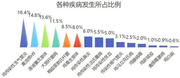 说明:本月三类疾病的发生比例变化比较明显,其中免疫控制性疾病的发生比例由41.1%上升至49%,垂直传播性疾病的发生比例由29%下降至22.4%,环境条件性疾病的发生比例没有明显的变化。进入冬季,外界气温较低,病毒以及细菌的存活能力提升,导致免疫控制性疾病的发生比例明显升高。 3、本月确诊禽病发生比例 说明: (1)本月确诊疾病发生比例较高的疾病依次为传染性支气管炎、禽流感H 9、滑液囊支原体、大肠杆菌病、鸭疫里默氏杆菌杆菌、鸡毒支原体,占确诊疾病的总体比例在72.8%。支原体、传染性支气管炎、大肠杆菌病的发生比例相对较高。 (2)三类疾病防控重点:垂直传播性疾病重点为支原体病;免疫控制性疾病的防控重点为传染性支气管炎;环境条件性疾病防控的重点是大肠杆菌病。 二、2026年1月份禽病防控重点 1、当前流行疾病的防控 ①传染性支气管炎疾病依然是疾病发生比例的榜首。因其病原易变异,同一基因型下不同血清的保护效果并不理想,并且能够快速的通过呼吸道传播,传播能力强,必须要经过免疫和环境控制综合防控手段才能有效防控。首先要做好免疫,科学的设计好免疫程序,选择两种毒株交叉保护谱比较广的疫苗进行免疫,使用麻株和流行毒株免疫提升保护谱,强毒株的疫苗不建议早期免疫;其次传支的免疫越早越好,1日龄的占位免疫尤为重要;在饲养管理方面尤其要注意早期鸡舍的温度的适宜均匀稳定,避免鸡群受到冷应激,降低鸡群感染传支的机率。 ②支原体病是常在的疾病。由于支原体感染之后在体内长期存在,并且在鸡群体质差,应激较大时重复发病,给鸡群造成生产性能方面的影响。支原体的防控需要从饲养、免疫和药物同时入手才能有效控制。首先选择垂传疾病控制好的种鸡厂家选择雏鸡,避免引种带入的病原;其次要提升饲养管理水平,避免各种应激的叠加;第三在易感地区或者场区建议使用活+死的免疫方式,降低鸡群的感染机率以及对环境的污染,逐步的净化场区内的支原体病原;第四,程序性的监测病原及时的进行投药控制,在鸡群的易感日龄、应激叠加的阶段进行支原体的敏感性药物进行治疗。 ③大肠杆菌病属于环境条件性疾病。首先要明确是原发性的还是继发性的疾病。原发性的大肠杆菌要环境控制方面入手,从鸡舍的空气质量、饲料、饮水方面控制微生物含量。针对继发性的大肠杆菌病需要找到病因,只有消除原发病因,才能有效控制大肠杆菌的发生。在治疗时选择敏感药物,科学使用才能有效的降低疾病的损失。 |
