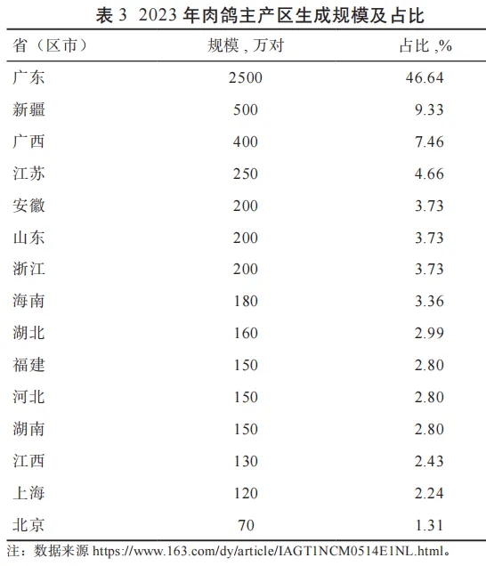 2 国内肉鸽生产及贸易情况 2.1 生产情况 根据中国禽业发展报告(2024年度)数据,2021—2024年我国肉鸽生产规模、产量、产值均呈现增长趋势。具体表现为: 1)种鸽总存栏量从2021年的4 080.5 万对增加到5 497 万对,增长了34.7%;2023—2024年肉鸽市场行情向好,养殖场纷纷扩产,将全国种鸽总存栏量推上历史高峰;2)乳鸽出栏量从2021年的 6.02 亿只增加到2024年的 8.04 亿只,增长了33.6%,与种鸽总存栏量保持同步上涨趋势;虽然2022年小幅回落至 5.84 亿对,但随着2022年底疫情防控政策优化、餐饮市场回暖带动肉鸽需求增长,2024年乳鸽出栏量创 10 年新高;3)乳鸽销售量由2021年的 5.8 亿只增加至2024年的 7.5 亿只以上,平均销售价格由2021年的 14.49元/只涨至2024年的 20.1 元/只;2024年乳鸽产值突破150 亿元,创历史新高,供需双驱推动销售量和销售价格双重增长,成为产值增长的核心动力。 2.2 主产区情况 当前我国肉鸽养殖广泛分布于东部沿海、西北内陆以及北部地区,总体呈现“广分布,小集聚”的态势。新疆、广东、安徽、四川、山东、江苏、广西、河南和湖南等 10 个主要产区出栏量占全国总量的 90%以上。根据 2023 年调研数据,广东种鸽约为 2 500 万对,新疆种鸽 500 万对,广西种鸽 400 万对(表 3)。 |