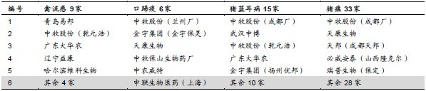 表1:强制免疫疫苗产品生产企业 以广东省疫苗招标为例:2013年春季主要招标中,口蹄疫(O型灭活)、禽流感(H5N1灭活)、高致病性猪蓝耳(JXA1-R株)、猪瘟(细胞源活疫苗)主要中标价格为0.43元/毫升、0.13 元/毫升、0.40 元/头份、0.20 元/头份,相对2009年变动幅度为8%、2%、-78%、-30%(注:选取主要中标价格)。