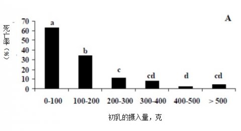 注:图标字母相同表示差异不显著,字母不同表示差异显著; 图1:初乳的摄入量与断奶前仔猪的死亡率之间的关系