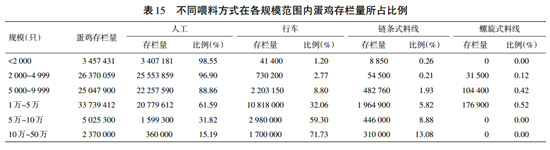 按存栏量分析,77.03%的存栏蛋鸡采用人工喂料。在5万只以下规模场(户)中,人工喂料饲养的蛋鸡存栏量所占比例最高。对于5万只及以上规模,行车喂料饲养方式的蛋鸡存栏量所占比例最高。行车喂料饲养方式的蛋鸡存栏所占比例随养殖规模扩大而上升,1~1999只规模所占比例仅为1.20%,10万~50万只规模所占比例高达71.73%。