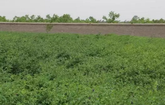2. 污水沉淀池。分为舍边的一级沉淀池、污水输送过程中的二级沉淀池和最终汇集的三级沉淀池。一级、二级沉淀池要靠近污道,三级沉淀池应选在生产区的下风向,储粪池附近,便于污泥的清运。三级沉淀池多为全地下式,深度2-2.5米,一般为上大下小的梯形,设有进污口和清污口,水泥底(15厘米左右)、四周砖墙(三七墙)和钢筋混凝土(25厘米左右)结构,并进行防水处理,设顶盖,做到防雨、防渗和防溢流。为避免沼气产生,应注意留有通风口。每出栏1头猪沉淀池容积不少于0.3立方米,最少能容纳4个月以上的污水产生量。 污水沉淀池 3. 粪污消纳用地。养殖场(户)要有与养殖规模相适宜的消纳用地,每出栏1头猪至少需0.2亩,建设输送管道或配套输送设备。 四、效益分析 该模式一般投资20-30万元,设施建设成本低、投资少、不耗能、不需专人管理、基本无运行费用,但对化学需氧量和氨氮去除率相对较低,适用于规模较小,周边有足够的需要常年施肥农田的养殖场(户)。 苜蓿种植(消纳粪肥和液态肥水) |