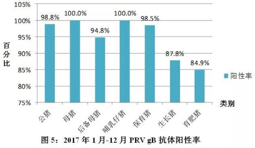 | (4)猪伪狂犬抗体水平 各生长阶段猪抗体水平较为理想,抗体阳性率接近或高于85%。生长及育肥阶段抗体阳性率稍低,应定期监测,必要时加强免疫。各阶段猪均有PRV野毒感染,公猪、后备母猪、生长猪与育肥猪抗体阳性率均低于35%,而母猪、哺乳仔猪及保育猪抗体阳性率均高于50%,其中哺乳仔猪阳性率最高达64.3%,说明猪场伪狂犬野毒感染普遍,净化任务艰巨。 (5)口蹄疫抗体水平 2017年1月-12月,共收到59个猪场送检的血清4663份,其中O型检测样品4663份,A型检测样品3665份,两种抗体阳性率分别为71.9%、71.2%,其中保育猪阳性率较低为20%,这也往往是人们容易忽视的一个阶段,应重视口蹄疫的首免日龄。 三、分析建议: 2018年预计猪场疾病仍然以混合感染为主。猪圆环病毒2型、猪伪狂犬与猪流行性腹泻在猪场普遍存在。猪场发病后临床症状多集中表现在呼吸系统、生殖系统和消化系统上。伪狂犬、蓝耳和猪瘟所引起亚临床症状及混合感染的防治,细菌混合或继发感染会加重病毒性疾病所带来的损失。特别关注哺乳仔猪与保育猪两个阶段的疾病感染,合理制定免疫程序与首免日龄。防控上:一是要选择适合的毒株疫苗和正确的免疫时机;二是做好猪场的生物安全,保育猪和育肥猪尽量做到全进全出,加强免疫和管理;三是根据实际情况确定和坚定猪场防控的路线。 |