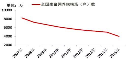 图4 中国生猪不同出栏量规模养殖比重 第五阶段:规模化发展阶段,2007年至今。21世纪以来,市场经济发展迅速,生猪产业快速发展,受宏观经济、大资本涌入、疫病、国家政策调控、食品安全事件、进口肉、环保政策等因素影响,生猪供应时而充足时而紧缺,供给和需求难以达到稳定均衡,生猪和猪肉价格呈周期性大幅波动。生猪产业上到饲料供应商、疫苗兽药供应商,中游的生猪养殖场户,下游的屠宰加工,以及终端消费者,无一例外都要受到不同程度的风险波及。 2007年农业部针对生猪养殖低产出低收益,成本高、突发疫病等问题造成供应短缺猪价大涨的情况,提出《关于促进生猪生产发展和稳定市场供应的意见》,政策上大力扶持生猪产业,促进生猪规模化和标准化发展。2007年全国生猪养殖户总数8235万户,年出栏超过500头以上养殖场户数12.5万户,占比全国总户数0.15%,出栏量1.752亿头,占比全国总出栏量21.8%。 在2007年-2014年这一段期间,猪疫情、政府补贴、瘦肉精事件、宏观经济下滑等左右生猪行情大幅波动,能繁母猪存栏在2012年达到最高点,之后猪价经历漫长的下滑期。在这一阶段,发展比较好的生猪养殖企业开始横向整合、猪场收购合并、扩产。 图5 全国生猪饲养规模场户数 2015年以来,国家新环保政策实施,生猪养殖面临前所未有的限养禁养政策。中小养殖户加速退出,规模养殖企业大幅扩张。芝华数据统计显示,生猪主产区广东、福建、安徽、湖北、河南等主产省份退出比例最高达30%。中小散户退出,或养殖区域转移,规模养殖企业继续增加产能,截止2015年末全国生猪养殖户数量降至4000万个。2016年年出栏500万头以上出栏量占比达到45%。 2016年4月份农业部发布十三五生猪生产发展规划,即《全国生猪生产发展规划(2016-2020年)》,政策上指导生猪产业转型升级和绿色发展。生猪养殖产业由横向发展向纵向延伸,进行全产业链覆盖,从产业链获取利润并分散风险。 3、当前中国生猪产业现状 ❤生猪供需结构 生猪的供需格局和猪肉的供需存在天然的强关联性,生猪的供给和需求关系,也受其下游产品猪肉的供需关系影响。按照产出顺序,生猪和猪肉的关系为前者是后者的基础产品,猪肉是生猪的下游产品,两者发生转变的环节在于屠宰环节。生猪屠宰量和屠宰均重影响猪肉产量,猪肉产量与猪肉进口量形成猪肉供给量,再和猪肉消费需求相互作用产生猪肉价格。环环相扣,猪价和猪肉价格涨跌互动互联。 |