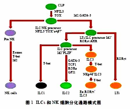 天然淋巴细胞(Innate lymphoid cells,ILCs)是新发现的一类重要淋巴细胞亚群,它们起源于普通淋巴祖细胞,不同于T、B淋巴细胞。ILCs 不表达抗原受体,在微生物的刺激下可快速活化并进入靶器官参与免疫应答。ILCs 位于黏膜表面,可增强免疫反应,维持黏膜的完整性,在黏膜屏障炎症性反应及组织损伤中发挥重要作用。本文简要阐述了ILCs 的分类、分化和迁移及在肠黏膜免疫中的作用。 1 ILC 的分类 ILCs 根据其表型、调控因子及分泌的细胞因子不同可分为ILC1s、ILC2s 和ILC3s 3 种类型, 这3 种ILCs 在功能上与辅助性T 细胞(T-helper-cell,Th)相似,因此又称为Th 的镜像细胞。 ILC1s 在功能上与辅助性T 淋巴细胞1(T-helper,Th1)类似,均可分泌I 型细胞因子,即肿瘤坏死因子(Tumour Necrosis Factor,TNF)和干扰素γ(Interferon-γ ,IFNγ ),因此,又称为Th1 的镜像细胞。ILC1s 包括分泌TNF 和IFNγ 的自然杀伤细胞(Natural Killer,NK)和其他分泌IFNγ 的天然淋巴细胞。早在1975 年研究发现,NK 细胞对肿瘤细胞具有细胞毒性作用。因此,作为天然效应淋巴细胞,NK 细胞在肿瘤监视、感染病毒细胞的清除及扩大炎症反应方面发挥重要的生物学效应。NK 细胞分布于二级淋巴器官、血液及外周器官,它们通过其表面的一系列受体如自然细胞毒性受体46(Natural Cytotoxicity Receptor46,NKp46) 及NK1.1 来识别和杀伤靶细胞。与NK 细胞相比,不分泌TNF 的ILC1s 细胞毒性较弱,它们可表达转录调控因子Tbet(T-box-family Transcription Factor), 促进其合成IFNγ ,因此,又称为Tbet ILC1s。 ILC2s 是Th2 的镜像细胞,可分泌II 型细胞因子如IL-5、IL-9 及IL-13。ILC2s 分布于血液、淋巴组织(如脾脏和骨髓)、非淋巴组织(如肝脏、肾脏、内脏脂肪组织等)、黏膜组织(如肺、肠黏膜等)。在人和鼠中,ILC2s 通过表达高水平的转录因子GATA 结合蛋白3(GATA Binding Protein 3, GATA-3)来调节ILC2s 发育和II 型细胞因子的分泌。除分泌II 型细胞因子外,ILC2s 还可促进肥大细胞、T 细胞(分泌IL-5 的T 细胞)增殖及杯状细胞分泌黏液。机体在寄生虫、病毒感染及过敏反应时,ILC2s 被激活。ILC2s 还与人类的一些慢性疾病如肺、肝脏纤维化有关。 ILC3s 由3 种不同细胞亚型组成,即表达趋化因子受体6(Chemokine Receptor 6,CCR6)的淋巴组织诱导ILC3s(Lymphoid-Tissue Inducer,LTi)、表达NKp46 的ILC3s(NKp46-ILC3s)、既不表达CCR6 又不表达NKp46 的ILC3s(DN-ILC3s)。这3 种类型的ILC3s 均受转录因子视黄酸相关孤儿受体γ t(RetinoicAcid-Related Orphan Receptor γ t, RORγ t)调控和IL-23和( 或)IL-1β 刺激而激活, 并分泌17 型细胞因子IL-22 或IL-17。因此,ILC3s 又称为Th17 的镜像细胞。ILC3s 分布于小肠黏膜固有层(人和鼠),在肠黏膜免疫中发挥重要作用。 2 ILCs 的分化和迁移 ILCs 与获得性免疫系统的淋巴细胞均来源于普通淋巴细胞祖细胞(CLP),但ILCs 祖细胞分化需要许多转录因子如白介素3 核因子(NFIL3)、转录抑制因子DNA 结合蛋白2(Id2)、胸腺细胞相关迁移蛋白(TOX)、GATA-3 及早幼粒白血病锌指(PLZF),此外,Th 的3 种转录因子T-bet、GATA-3 和RORγ t 在ILCs 的生成和维持中也发挥重要作用。存在于骨髓的CLP 在转录因子NFIL3 和TOX 作用下分化为ILC/NK前体细胞,在Eomes、T-bet 和Id2 的作用下最终转化为成熟的NK 细胞。ILCs 前体细胞在Id2、GATA-3 作用下转化为LTi/ILC 前体细胞,在RORγ t 作用下LTi/ILC 前体细胞转化为LTi。在Id2 和PLZF 作用下,LTi/ILC 前体细胞转化为ILCs 前体细胞,ILCs 前体细胞在T-bet 作用下分化为ILC1s。在GATA3、T 细胞因子1(TCF1)、RORα、独立生长因子(GFI1) 的作用下ILCs前体细胞分化为ILC2s。在RORγ t、芳香烃受体(AHR)、T-bet 作用下ILCs 前体细胞分化为NK46+ILC3(图1)。 |