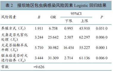 3.1 单因素分析 以场群是否感染包虫病为因变量, 应用SPASS 软件对问卷中设置的 11 个风险因素进行单因素分析,具有统计学意义(P<0.05),且均为风险因素的变量有 8 个,分别为繁殖方式、养殖方式、是否养犬、犬是否接触羊牛群、犬粪是否无害化处理、饲料放置地是否有犬科动物、驱虫后是否对犬进行拴养、养犬数量。 3.2 Logistic 回归 对筛选出的 P<0.05 的 8 个因素进行相关性检验,其中“是否养犬和饲料放置地是否有犬科动物”“养犬数量和驱虫后是否对犬拴养”的相关系数> 0.4。结合包虫病相关生物学知识,剔除“是否养犬、养犬数量”两个变量进入 Logistic 回归模型。按照有条件向前方法,最终筛选出“养殖方式(X1)”“犬粪是否无害化处理(X2)”“犬是否接触羊牛群(X3)”“驱虫后是否对犬进行拴养(X4)”4个变量具有统计学意义。模型公式为: Log(odds)= –9.626+1.911 X1+3.244 X2+5.710 X3+3.444 X4 通过 Hosmer-Lemeshow 检验, 对模型进行拟合优度检验,发现卡方值为 1.422(df=7,P=0.985),证明该模型拟合较好。 针对建立的 Logistic 回归模型绘制了 ROC曲 线(图1)。 曲线下面积为 0.961(95%CI:0.926~0.996),表明此模型预测感染包虫病风险能力较好。 图1 针对 Logistic 回归模型绘制了 ROC 曲线 4 讨论 接坝地区羊养殖量相对于牛要高,饲养管理比较粗放,以半舍饲、半放牧的养殖模式为主。当地养殖户养犬主要是为了对羊群进行保护,犬放养形式居多,与牛羊接触比较频繁,容易造成包虫病的感染。由于受当地无害化处理条件限制,犬粪无害化处理在实际操作中存在一定难度。建议当地养殖户对家庭犬只进行管理,制定合理的驱虫方案,限制散养犬接触牛羊群。本次问卷调查由于受时间及调查人员因素限制,只对一些可能引起包虫病感染的风险因素进行设计,问题不够全面,结果可能存在偏倚。 5 结论 包虫病感染风险因素研究表明:牛羊养殖方式粗放、犬粪不进行无害化处理、犬密切接触羊牛群、 驱虫后没有对犬进行拴养是包虫病感染的潜在风险因素。因此,该地区的养殖户要加强牛羊管理,对犬合理驱虫,限制散养犬接触牛羊群。 |