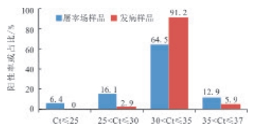 图1 屠宰场样品中 SVA 荧光 RT-PCR 扩增 Ct 图值的分布 图 2 屠宰场样品和发病样品中 SVA 阳性样品的比例分布 2.4 时间分布情况 2016—2018 年的病料样品 SVA 监测结果显示:2016 年 3 个省份检出阳性,占比为 14.6%,2017 年5个省份检出阳性,占比为 21.9%,2018年 3 个省份检出阳性,占比为 22.6%,呈现逐年增加的趋势,也表明 SVA 早在 2016 年就已在我国多 个省份的猪群中流行。 3、讨论 本监测研究了 SVA 时间、空间分布等流行病学规律,通过对保存的病料进行检测,证实 SVA 在我国猪群的流行至少可以追溯到 2016 年,与Wu 等 报道的时间基本一致。通过对不同时间样 品进行检测发现,2016 年 SVA 存在于辽宁、四川 和山东等 3 个省份,2017 年存在于辽宁、四川、山东、上海、贵州等 5 个省份,2018 年存在于辽宁、上海和山东等 3 个省份。2018 年对 7 个省份的 36个屠宰场进行监测发现,调查的湖南、云南、新疆、辽宁、福建、湖北、广西等 7 省份均有不同程度的 SVA感染,个体样品阳性率为11.2%(2.7%~25.0%),场阳性率为 48.6%(20.0%~100%)。因调查的屠宰场位于不同的县,所以屠宰场阳性率更能反映出 SVA 的污染面。考虑到福建、湖北等省份已有检测到 SVA 的报道,且本次监测的福建(100%)和湖北(80.0%)屠宰场阳性率均较高,由此认为 福建和湖北两省 SVA 的污染面较广。另外,有学 者报道,我国的黑龙江、河南、福建、湖北、广东等 5 省均检测到 SVA 感染。从以上结果可以 看出,我国感染 SVA 的省份至少已有 14 个(图 3)。 |