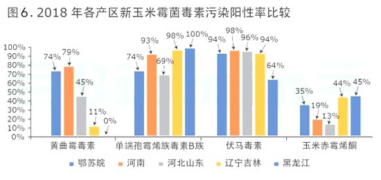 由表4可见,从黄曲霉毒素污染水平来看,杂粕类和DDGS受污染程度较重,分别有72.6%和25%的样品检测值超过高风险值(>4ppb),而豆粕和精饲料中黄曲霉毒素污染程度不高,麸皮最轻,为1.3%。 玉米赤霉烯酮对各种饲料原料污染程度不高,仅DDGS中有20%的样品超过高风险值,值得提示的是,麸皮中玉米赤霉烯酮最高值达到了2067ppb。 单端孢霉烯族毒素B族污染水平不一,麸皮和DDGS受此类毒素污染严重,分别有67.5%和85%的样品检测值超过高风险值。而精饲料和杂粕类污染较轻,豆粕和棉籽棉粕类更是均未超高风险值。 六、几种毒素的风险分析 由图4可见,粗饲料中黄曲霉毒素的污染属于低风险,单端孢霉烯族毒素B族污染属于高风险,玉米赤霉烯酮在粗饲料中的污染情况处于中等偏高风险水平。 由图5可见,奶牛精饲料中单端孢霉烯族毒素B族污染严重,34%的送检样品检测结果位于中高风险水平。玉米赤霉烯酮风险不高,高风险值仅占5.8%;黄曲霉毒素污染较严重,16.9%的样品中黄曲霉毒素含量超过4ppb。 七、2018年玉米普查 2018年共采集秋季新玉米216份,主要来自大中型饲料与养殖企业,少部分来自收粮点。数据见图6、表5。 |