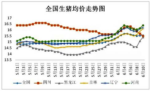 临近端午前一周屠企不断抬高肉价,然市场接受能力有限,鲜销订单下滑,压价意愿强烈,猪价出现回调。但是在端午假期的第二天开始,东北、河南等地率先反弹,而此时西南市场依然处于持续下滑态势。据猪易数据监测显示,截止6月10日东北地区生猪均价为15.9元/公斤,西南生猪均价则为14.73元/公斤,价差达1.17元/公斤。昔日的辉煌已成往事。具体详情如下: 由上图可以看出,5月上中旬猪价整体呈现稳中下滑走势,至下旬猪价开始呈现上涨态势,尤其是月底至月初涨速加快,北方除黑龙江价格相对较低,大部分地区猪价达到“8”元大关;截止6月4日,黑龙江规模场外三元在15.6元/公斤。 四川规模场出栏价在16.0-16.5元/公斤。随着原料成本大幅上涨,屠宰厂多抬高肉价。然而终端市场持续低迷,高价白条走货放缓,屠企订单量下滑,开启压价模式。但是整体猪源减少,压价幅度以及持续时间均有限。截止6月8日全国外三元生猪均价为15.5元/公斤,较6月4日下跌0.2元/公斤。 而东北和河南由于前期去产能幅度较大,在端午期间率先出现反弹,尤其是黑龙江涨幅较明显,截止6月10日黑龙江生猪均价为15.4元/公斤,较6月8日上涨0.8元/公斤,涨幅在5.47%。目前北方市场生猪出栏价已全面破8。 反观四川市场,由于疫情较严重,散户抛售,猪源增加,猪价持续下滑。截止6月10日省内生猪均价为15.5元/公斤,较6月6日的16.3元/公斤,下跌0.8元/公斤,跌幅为4.9%。 近期北方猪源将愈发紧俏,整体价格仍有上涨可能。但是由于采购成本高企以及销量下滑,屠企的开工率将有所降低,涨幅将受到抑制,局地不乏有企稳可能。而目前南方疫情仍处于高发期,局地抛售仍较多,尤其是四川、重庆等地散户抛售情况较多,猪源供应偏多,但是需求欠佳,猪价或继续下滑。短期冰火两重天局面或延续。 |