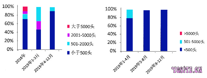 (三) 流行特点 从疫情发生的养殖场规模看,小规模场户占78%。2019年8月以后,所有报告疫情均发生在小规模养殖场户(图4)。 图4 非洲猪瘟群间(规模化程度)分布图 从疫情发生的地理位置看,2019年共有20个省份报告疫情,疫情集中区域从2018年的北部区转向2019年4-12月的西南区(图5)。 图5 非洲猪瘟疫情地区时间分布 (四)主要传播路径 调查表明,当前国内疫情的主要传播途径包括车辆/人员机械性传播(43%, 65/150),餐厨剩余物喂猪(19%, 28/150)和感染生猪及风险产品调运(38%, 57/150)。 14个省份的首例报告疫情与餐厨剩余物喂猪有关。其中,存栏500头以下发病场户中,49%(51/104 )由餐厨剩余物喂猪引发疫情。2019年传播途径以车辆/人员机械性传播为主(54.0%),其次为餐厨剩余物喂猪( 30.0% ),2019年后4个月仅有一起疫情由车辆/人员机械性传播引起(图6)。 图6 非洲猪瘟传播路径分布图 |