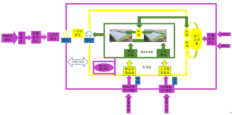 2.1场区布局 2.1.1生物安全区界限划分 红区:猪场外部不可控区域(缓冲区)。主要设置在距离猪场不低于3公里区域,包括建立人员隔离中心、物品处理中心、中转场、车辆洗消中心等。 橙区:猪场围墙至外部可控区域,包括环保处理区(粪污池和污水处理系统)、无害化处理区。 黄区:猪场围墙内部至猪舍外部区域,包括生活区、隔离区、门卫区。生活区为人员进入、生活、休息、娱乐的所有立体空间及物资进入、存储区域,包括人员进场淋浴场所、物资进入熏蒸消毒通道、各类物资存储间、各类宿舍、办公室、会议室、厨房、餐厅、生活区、娱乐区域、洗衣房及周边空地等。 绿区:猪舍及猪舍连廊内部等生产区,为生猪日常饲养管理、转移及饲养人员休息就餐、药械物资及维修用品消毒存贮等所涉及到的全部区域。包括配种舍、后备隔离舍、培育舍、诱情舍、产房、待转舍、猪只转移连廊、操作间、清洗房等绿区内立体空间全部实物(墙体、地沟、设备、管线等)。 图1.规模猪场颜色体系分区示意图 2.1.2净区与污区 净区与污区是相对的概念,生物安全级别高的区域为相对的净区,生物安全级别低的区域为相对的污区。 在猪场的生物安全金字塔中,公猪舍、分娩舍、配怀舍、保育舍、育肥舍和出猪台的生物安全等级依次降低。猪只和人员只能从生物安全级别高的地方到生物安全级别低的地方单向流动。净区和污区不能有直接交叉,严禁逆向流动,必须有明确的分界线,并清晰标识。 另外,经消毒处理的环境区域也为净区,包括经过消毒处理的人员、车辆、物资接触区域,以及正常生猪直接饲养区域。未经消毒处理的环境区域为污区,包括未经消毒处理的人员、车辆、物资接触区域,以及病死猪接触区域和粪污处理区等。 2.2猪场建设 严格参照《规模猪场建设》(GB/T17824.1)、《规模猪场环境参数及环境管理》(GB/T17824.3)、《畜禽粪便贮存设施设计要求》(GB/T27622)、《规模猪场清洁生产技术规范》(GB/T32149),《畜禽场场区设计技术规范》(NY/T682)、《标准化规模养猪场建设规范》(NY/T1568)、《种公猪站建设技术规范》(NY/T2077)、《种猪场建设标准》(NY/T2968),以及《病死及病害动物无害化处理技术规范》等技术要求,独立设计、建设不同功能区。 2.2.1围墙 围墙可以隔断猪场和外界的直接连通,需要具备防人、防鼠、防野猪、防犬猫等功能,要求实心、结实、耐用。可以用砖墙,也可以用彩钢板等简易材料建设。 2.2.2道路 净道和污道严格分开,避免交叉。 |