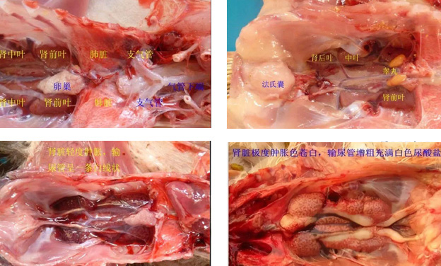 | 肠道内容物是橙色粘液提示巨型艾美尔球虫感染。 小肠肠腔内有深红色血液提示小肠球虫。 肠壁呈蓝灰色,肠浆膜有黑色絮状物,肠黏膜覆盖一层黑色的伪膜提示霉菌性肠炎。 肠胀气,有时肠壁有出血斑点像花布样、肠腔内有未消化的饲料颗粒、后期肠道呈蓝灰色,肠黏膜覆盖一层黑色的伪膜提示梭菌感染。 盲肠:鸡有两个盲肠,盲肠的根部与直肠相连的地方是盲肠扁桃体。 盲肠内容物正常的颜色为黄棕色或黄酱色 盲肠扁桃体红肿出血,提示新城疫或流感等。 盲肠内有血凝块或血液提示盲肠球虫。 雏鸡盲肠粗大、手感硬,内有灰白色干酪样物提示沙门氏菌感染。 盲肠内有干酪样物,切面呈同心圆,中间有血液凝块提示组织滴虫病(又称盲肠肝炎)。 直肠、泄殖腔出血的位置不同,可以做为鉴别新城疫和流感的一项参考依据:新城疫的直肠有点状、条状或弥漫性出血;禽流感在直肠的末端和泄殖腔弥漫性出血,这是我通过几年对无数病例的观察总结,死亡率高的时候一定要多解剖几只死鸡,准确率在90%以上。但是活的病鸡往往病变不明显,不具有特征型。 (6)检查支气管、肺脏、卵巢、睾丸、肾脏、法氏囊。 A、支气管在心脏的下面,小心剪断血管,取出心脏后即露出支气管,正常的支气管呈透明状。 支气管内有浅黄色粘稠或干酪样物提示传染性支气管炎。 支气管内有灰绿色菌丝斑块提示霉菌感染。 B、肺脏 肺脏正常为粉红色在心脏的两侧、气囊的下方,贴在肋骨的内侧面。 肺脏出血、坏死提示流感。 肺脏有灰白色结节提示霉菌感染或雏鸡白痢。 肺脏有大小不一的灰白色肿瘤病灶提示马立克氏病或淋巴细胞白血病。 |
