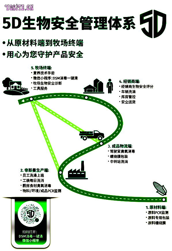 目前帝斯曼提出的5D生物安全管理体系(如图),就是旨在连接企业层面和家禽场层面,共同的促进生物安全水平提高。