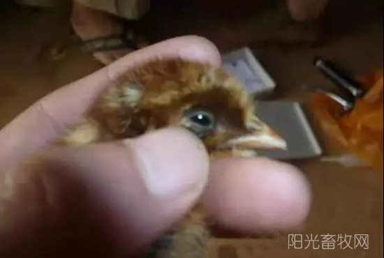 图2 中指、无名指、小指把雏鸡固定住,让雏鸡右侧脸朝上
