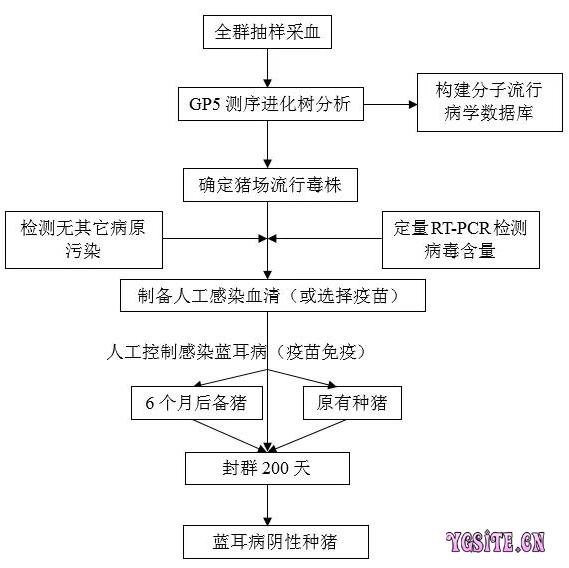 | 5. PRRS净化过程中产房仔猪监测 由于产房仔猪采血应激大,唾液不好采。可收集阉公睾丸液和断尾液体(图1),检测蓝耳抗原及其他病原,监测是否有母猪垂直传播感染。 图1 阉割睾丸和断尾液体 6. PRRS净化过程中保育监测 在血清(或疫苗)驯化的2-4个月内每周要多配10%-30%的母猪(根据实际影响调整)。驯化后12周开始检测断奶仔猪,连续测8周(5000头母猪场,一周240窝,2400-2500头仔猪,测30窝,每窝2头,共60头仔猪的检测量),如果批批阴性,那么证明母猪群已经稳定,产出阴性仔猪。配合实施保育舍清群。母猪群继续封群至200天,此时母猪群就完全净化了蓝耳病。 保育舍清群要点: 一是清空保育阶段的猪群,旨在把易感动物全部清走; 二是按照相关标准规范,消灭环境中的病原体:清扫猪舍一定要高标准严要求,做好有机物的清除和猪舍的消毒工作。建议:在喷消毒剂前,先用70~80℃的热水进行清洗,中间要进行一次熏蒸消毒。 三是空栏时间要足够长,2周左右,最低不少于10天。依据季节和当地的气候进行相应调整,特别是潮湿寒冷的季节要延长空栏时间。 7. PRRS净化过程中育肥监测 定期在保育中期和育肥中期采集唾液或血清检测蓝耳病毒,阳性样品测序鉴定是野毒还是疫苗毒。整个猪场,所有蓝耳阳性血清都要保存于-80度冰箱,以备后续血清驯化用。 8. PRRS净化总体技术路线 |