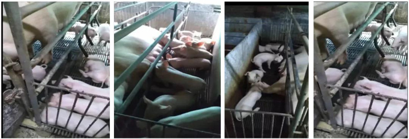 在另外一栋舍里,仅有1头妊娠后期母猪在使用方案第9天时出现了拒食,当天唾液检测非洲猪瘟病毒阳性而被淘汰,此后该栋猪只没再出现厌食或淘汰现象。同时,临床观察还发现,注重生物安全的同时,通过使用发酵类产品诸如发酵中药、发酵有机酸和活性多肽等综合方案,来提升猪群的免疫力和健康度,主要从三方面表现最为明显:首先,改善了肠胃功能,能不同程度地促进猪群对营养物质的消化吸收,提高了采食量,满足抗病营养需求;其次,可润肠通便,减少便秘,避免了毒素体内蓄积,猪群常规饲料消化后为黑色颗粒状干粪球,使用发酵产品后呈团状粪便或稀软粪便(图5);再次,可保肝护肾,加速新陈代谢,减少母猪眼屎泪斑、尿液发黄等亚健康问题(图6)。方案执行一个月后,该场恢复配种等生产活动,产房母猪产仔顺利,母猪奶水充裕,仔猪活力旺盛,场区负责人十分满意(图7)。 图5 左二图为使用方案前,母猪黑色颗粒状干粪球,表面光滑。右二图为使用方案后,母猪团状粪便或稀软粪便 图6 左二图为使用方案前,尿液部分深黄褐色,泪斑严重,肝损伤严重。 右二图为使用方案后,尿液澄清微黄,眼周干净,肝功能恢复 图7 产房母猪自然分娩,母猪奶水充裕,仔猪活力旺盛 |