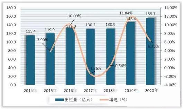 家禽是指人工豢养的鸟类动物,主要为了获取其肉、卵和羽毛,也有作为其他用处。一般为雉科和鸭科动物,如鸡、鸭、鹅、鹌鹑等,也有其他科的鸟类如火鸡、鸽和各种鸣禽的。家禽除了给人类提供肉、蛋外,它们的羽毛和粪便也有重要的经济价值。 家禽行业是我国重要的养殖行业,是我国农村经济除种植业、家畜养殖行业以外的主要支柱产业。2014-2018年全国家禽存栏量在60亿只左右波动,在2019年、2020年 家禽产能规模大幅提升,截止2020年我国家禽存栏量增长至67.8亿只,同比增长3.99%。 2014-2020年我国家禽存栏量及增速 数据来源:国家统计局 近年来我国家禽饲养规模持续扩大,存栏量增长明显,家禽出栏量也逐步增长。国家统计局数据显示,2020年我国家禽出栏量 155.7亿只,比上年增长9.3亿只,同比增长6.35%。 2014-2020年我国家禽出栏量及增速 数据来源:国家统计局 |