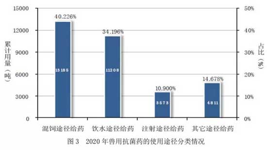 三、按使用途径分类统计结果 使用途径包括混饲途径、饮水途径、注射途径和其它途径等4类。混饲途径仅含预混剂,饮水途径包括可溶性粉剂和溶液,注射途径包括注射液、注射用粉针等;其他途径包括粉剂、片剂、乳房注入剂及子宫灌注剂。2020年使用的兽用抗菌药以混饲途径为主,总量为13184.734 吨,占比40.226%;饮水途径使用总量为11208.270吨,占比34.196%;注射途径使用总量为3572.531吨,占比10.900%;其他途径使用总量为4810.762吨,占比14.678%。详见图3。 四、按使用目的不同分类统计结果 2020年我国使用的兽用抗菌药可分为促生长和治疗2大类,其中促生长使用的用量为9403.211吨,占比28.69%。详见表 3。 五、生产每吨动物产品消耗抗菌药量 根据我国畜牧兽医年鉴和水产统计年报,2020年我国畜禽肉产量7639万吨,蛋产量3468万吨,奶产量3530万吨,水产品产量5224万吨,总计19861万吨。2020年各类抗菌药使用总量32776吨,据此测算每吨动物产品兽用抗菌药使用量约为165克。详见表4。 |