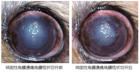 2.2 顽固性角膜溃疡 顽固性角膜溃疡又称“慢性角膜上皮糜烂” 、“拳狮溃疡”、角膜上皮发育不良“。是由于角膜结构自身的缺陷,造成的慢性浅表的角膜溃疡。一般病程长,愈合时间慢,单纯的药物治疗很难使溃疡完全愈合。 对于顽固性角膜溃疡的治疗除了药物以外,同时还需要外科手术的方法。目前常用方法包括、角膜清创术、角膜格状切开术、角膜表层切除术等。目的是将病灶周围不健康的组织去除掉,此手术可以借助手术显微镜。一般手术后90% 的病例在7-10 天内痊愈,少数病例会实施二次手术。在治疗某些特殊病例时我们也可以给动物佩戴隐形眼镜帮助角膜愈合,一般需要动物保持安静,如果动物反抗可以适当镇静,同时将眼睑缝合一针防止眼镜脱落。 2.3 后弹力层膨出、角膜穿孔治疗 多数后弹力层膨出病例是由深层角膜溃疡继发而来,当基质层的损伤深度达到整个角膜2/3 或3/4 厚度时,在眼内压力的作用下后弹力层会出现膨出甚至造成穿孔。 当角膜损伤程度达到2/3 或3/4 甚至接近穿孔时多数情况下药物治疗是无效的。应该及时采取结膜瓣遮盖术防止角膜穿孔发生。 当角膜穿孔时治疗方法只能通过手术,如果穿孔时间较短的伤口根据情况采取角膜缝合。如果穿孔时间较长且伤口已被感染应彻底清创后在进行结膜瓣遮盖术。发生虹膜脱出或晶状体异位时需要切除部分虹膜或将晶状体摘除。 3.结果 不同程度的角膜溃疡采取不同方法治疗84 例(87 眼)。其中5 例眼球摘除(原因有3 例术前已发生青光眼另外2 例术后继发全眼炎),6 例结膜瓣撕脱,(原因术后动物感到眼部不适抓蹭导致缝线断裂),其余73 例全部康复。 |