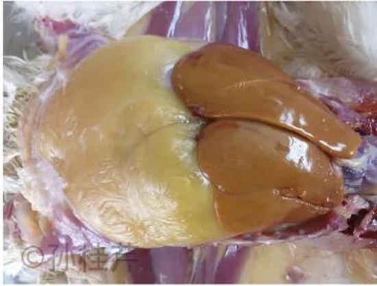 21 脂肪肝 本病多见于产蛋母鸡,为笼养鸡常见的一种营养代谢病,笼养鸡活动空间小,如果采食量过多,摄取能量过多,大量的脂肪沉积在肝脏内。另外,如果长期胆碱缺乏,含硫氨基酸(一般指蛋氨酸、赖氨酸等)、VB12缺乏,或因采食发霉变质的饲料等常成为本病发生的诱因,发病和死亡的鸡大多过度肥胖,病死鸡的皮下、腹腔及肠系膜均有大量脂肪沉积,肝脏肿大,边缘钝圆,病初呈黄色油腻状(又称作脂肪浸润),随着病情的发展,肝脏有出血点或血肿,质地极脆,易破碎如泥样,病情严重时肝脏破裂出血,在肝脏周围有多量血凝块将肝脏包裹。 肝脏肿大,边缘钝圆呈黄色油腻状 22 禽组织滴虫病 禽组织滴虫病又叫黑头病或盲肠肝炎,是由火鸡组织滴虫引起。 本病的主要病变局限在盲肠和肝脏,典型的病例可见盲肠肿大,肠壁肥厚紧实,盲肠黏膜发炎出血,形成溃疡,表面附着干酪样的坏死物质或形成硬的肠芯。同时肝肿大并出现特征性的坏死灶,肝体积增大,表面形成一种圆形或不规则的稍稍凹陷的溃疡灶,溃疡呈淡绿色或淡黄色,边缘稍有隆起。病灶的大小和多少不一,自针尖、豆大至指头肚大不等,散在或密布整个肝脏表面,有时可互相连接成大片的溃疡区。 肝脏表面有车轮状的黄褐色大小不一的坏死灶 |