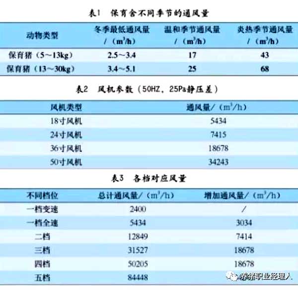 北方培育舍冬季通风模式:对于培育舍有吊顶的生产场,必须保证有足量的新鲜空气从进风口进入吊顶层,吊顶通风小窗开启1-3厘米(做到晚、早调节),并保持一致开启角度使圈舍空气均匀分布;而对于没有吊顶只有通风管的场也必须保证新鲜空气进入通风管口。切记不要从夏季使用的水帘进风,以免造成圈舍热量快速流失、温差过大导致猪群应激。 各种类型猪舍冬季最小通风量计算依据 举例说明:某个培育单元,长18m,宽14m,高2.6m,饲养700头仔猪 冬季培育期仔猪:13.5-34kg,最小通风量:8.5m³/h,总通风量:8.5m³/h*700头=5950m³ |