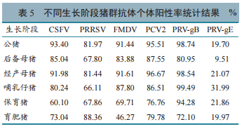 2.2.1 CSFV 由表3 可知,四季的场阳性率分别为 99.60%、99.52%、98.62%、98.62%,差异不显著;个体阳性率分别为 83.04%、82.79%、79.02%、73.99%,春夏季间和秋冬季间差异不显著,但春夏两季与秋冬两季之间差异显著。 2.2.2 PRRSV 春、夏、秋、冬四季的个体阳性率分别为 80.08%、76.11%、73.29%、74.47%,其中春季个体抗体阳性率显著高于其他季节,不同季节间的场阳性率差异不显著。 2.2.3 FMDV 春、夏、冬3 个季节的场阳性率均为 100%,秋季为 97.78%;4 个季节的个体阳性率分别为 88.06%、82.95%、81.48%、84.16%,春季显著高于其他季节,而其他3个季节间无显著差异。 2.2.4 PCV2 春、夏、秋3 个季节的场阳性率均为 100%,冬季为 98.57%,四季间的场阳性率无显著差异;夏季的个体阳性率为 92.04%,显著高于其他 3 个季节,而其他 3 个季节间无显著差异。 2.2.5 PRV 春、夏、秋、冬四季的 PRV-gB 抗体场阳性率均为 100%,个体阳性率分别为 95.98%、95.38%、96.52%、90.07%,其中冬季个体阳性率最低,与其他 3 个季节差异显著。夏季的 PRV-gE抗体场阳性率为 59.05%,显著高于秋冬两季,而与春季差异不显著;冬季个体阳性率为 15.50%,显著低于其他季节,而其他 3 个季节间无显著差异。 2.3 不同地区 2.3.1 CSFV 由表4可知,14 个地级市送检的样品中,除贺州市(68.56%)外,其他市的个体阳性率均达到 70% 以上,其中百色市最高,达到91.53%;除玉林市(99.07%)、南宁市(98.51%)、北海市(92.86%)外,其余各市的场阳性率均为100%。 2.3.2 PRRSV 钦州、来宾的个体阳性率较低,分别为 43.72%、48.84%;玉林、贺州、梧州、百色较高,均在 80% 以上;其他市的个体阳性率介于 68.57%~78.46%。14 个地级市的场阳性率均在87.50% 以上,其中贵港、河池和梧州场阳性率达到 100%。 2.3.3 FMDV 14 个地级市中,百色市未检测FMDV 抗体。其他 13 个市中,北海(66.25%)、防城港(68.84%)、来宾(58.72%)个体抗体阳性率未达到70%,其余均在77.18%以上,其中南宁、贺州超过了 90%。场阳性率除南宁市为 98.72% 外,其余均为 100%。 2.3.4 PCV2 14 个地级市的个体阳性率均在81.92% 以上,其中南宁、玉林、北海、崇左、河池、贺州、来宾超过了 90%;场阳性率除防城港为 93.75% 外,其余均为 100%。 2.3.5 PRV 14 个地级市的 PRV gB 抗体个体阳性率均在 84.85% 以上,其中 12 个市均在92.75% 以上,场阳性率均为 100%。14 个地级市均检出 PRV-gE 抗体阳性,其中钦州、河池、防城港阳性率较低,个体阳性率和场阳性率分别介于 3.91%~7.47% 和 14.29%~28.57%, 而玉林、 贵港、百色较高,个体阳性率和场阳性率分别介于31.59%~41.35% 和 62.50%~66.15%。 2.4 不同生长阶段 |